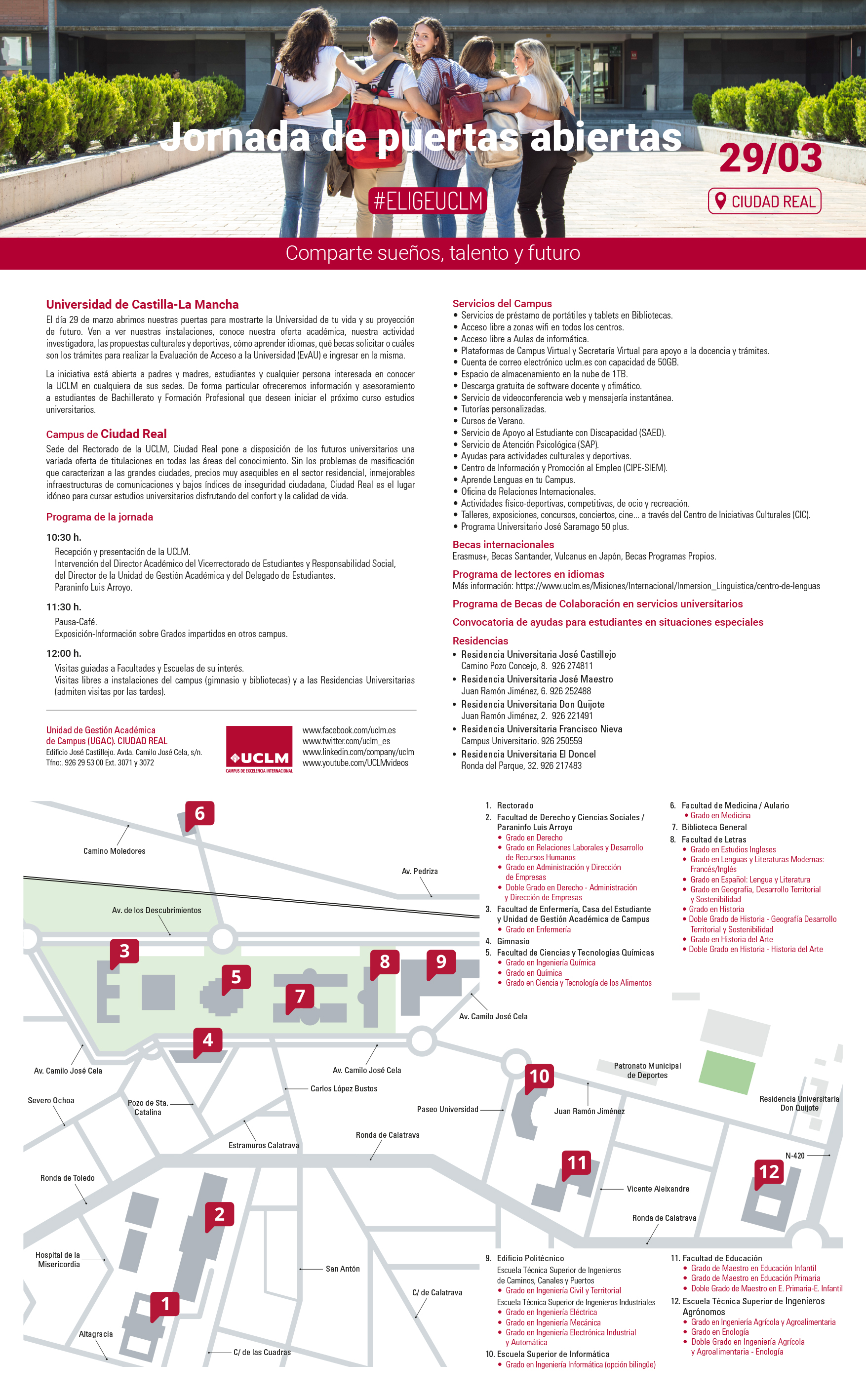 El domingo, 1 de marzo, arranca en el Campus de Cuenca una nueva edición de las jornadas de puertas abiertas de la Universidad de Castilla-La Mancha (UCLM) dirigidas a estudiantes preuniversitarios y familiares. La iniciativa, con la que la institución académica quiere dar a conocer su oferta académica, servicios, recursos e instalaciones, continuará el 8 de marzo en Toledo y Talavera de la Reina, el 15 en Albacete y concluirá el 29 en Ciudad Real y Almadén.