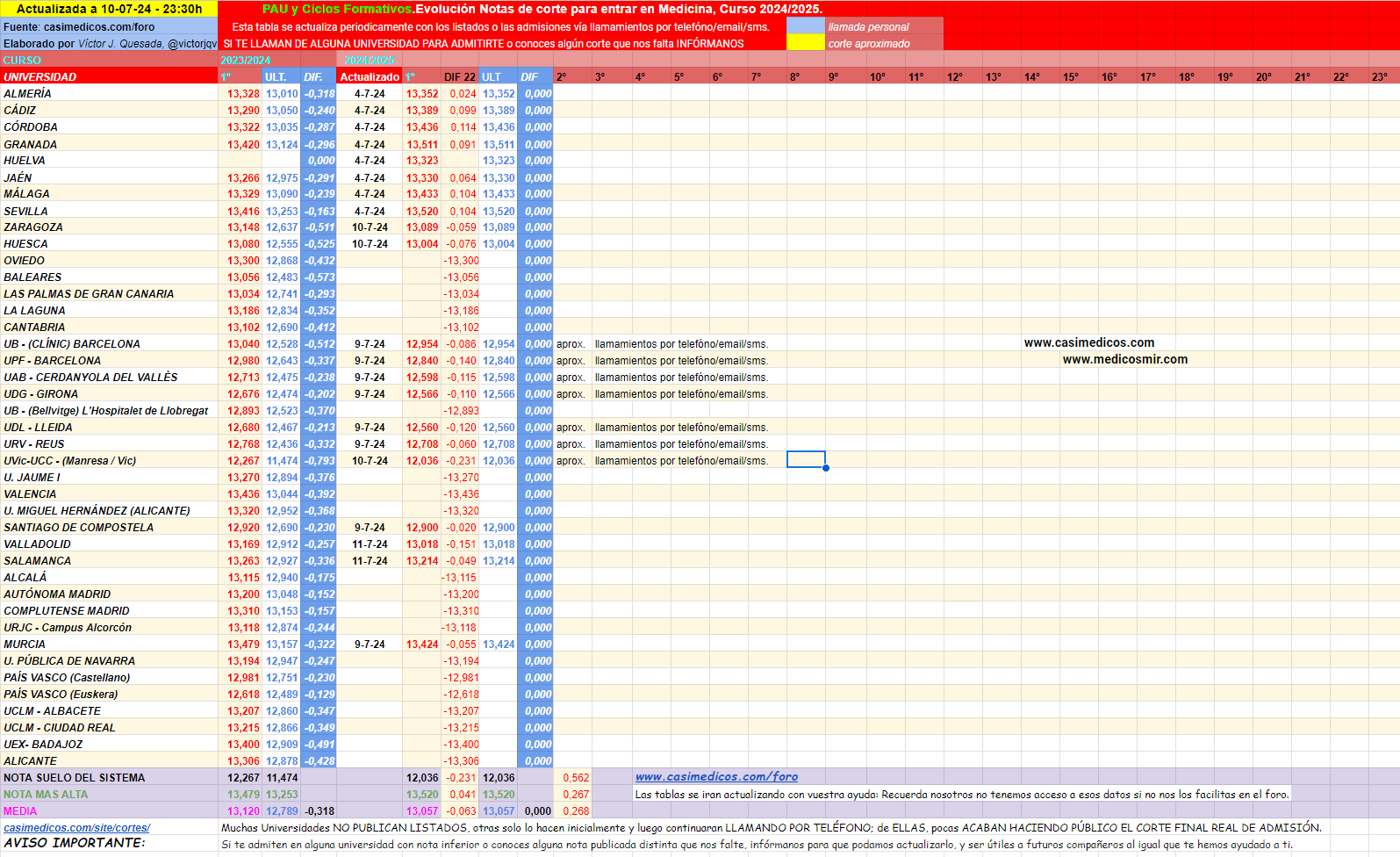 Recuerda que muchas FACULTADES NO PUBLICAN LISTADOS, otras solo lo hacen inicialmente y luego continuaran LLAMANDO POR TELÉFONO; de ELLAS, pocas ACABAN HACIENDO PÚBLICO EL CORTE FINAL REAL DE ADMISIÓN. Con lo que la única información real y actualizada que tendrás será la del observatorio de casiMedicos.com. Pero para poder ofrecerte dicha información y previsiones necesitamos tanto de tu colaboración introduciendo las notas y movimientos de listas en el observatorio, como la DIFUSIÓN del Observatorio entre tus amigos y conocidos, cuantos mas futuros estudiantes participen mas fiable y útil será la información.